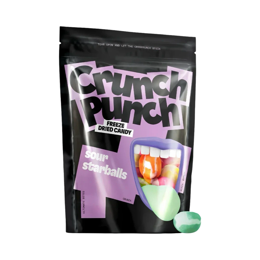 Crunch Punch - Freeze Dried Candy (Gefriergetrocknete Süßigkeiten) - Fruity Starballs 50gInhaltsstoffe: Zucker, Glukosesirup, Palmfett, Feuchthaltemittel (Sorbitsirup), Säuerungsmittel (Citronensäure), Gelatine, Frucht- und Pflanzenkonzentrate (Saflor, Zitrone, Spirulina, Rettich, Schwarze Johannisbeere, Karotte, Apfel), Aroma, Säureregulator (Natriumhydrogencarbonat), Trennmittel (Talkum), Sonnenblumenöl, Überzugsmittel (Bienenwachs Weiß und Gelb).Hinweis: Bis zu 5% des Inhalts können in Größe und Konsistenz Variieren und möglicherweise nicht vollständig gefriergetrocknet sein.An einem trockenen Ort und bei Raumtemperatur Lagern. Energie1770kj/418kclFett5,26gDavon gesättigt2,55gKohlenhydrate91,78gDavon Zucker60gEiweiss0,86gSalz0,04gHerkunftsland: Estland